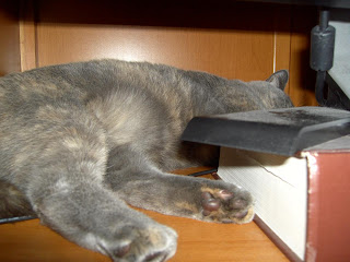 Yawn... you still here? This is the 'alternate' sleep position. Perfect spot for easy head scritches, but can be in danger of getting pulled off the computer table. Too tired to move now...zzzzz....